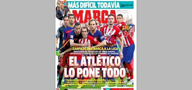 عنونت صحيفة «ماركا» الإسبانية غلافها أمس «أتلتيكو يصنع كل شيء»، على الرغم من خسارته مواجهة القمة أمام برشلونة 1-2 في الدوري الإسباني. وقالت الصحيفة إن «الحكم ارتكب خطأين جسيمين ضد أتلتيكو»، فيما اعترفت بالتدخل العنيف الذي تعرض له الأرجنتيني ليونيل ميسي من المدافع البرازيلي فيليبي لويس. ووصفت الصحيفة المباراة: «فوز باهت لبرشلونة».