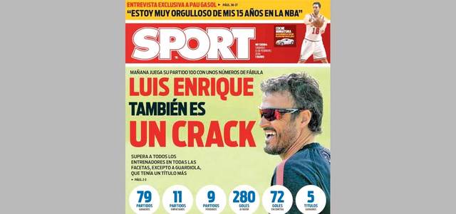 عنونت صحيفة «سبورت» الإسبانية غلافها أمس: «لويس إنريكي هو أيضاً نجم». وقالت إن «مدرب برشلونة سيكمل اليوم أمام ليفانتي مباراته رقم 100 مع الفريق»، مضيفة أن «إنريكي تخطى جميع المدربين في أرقامهم بأول 100 مباراة ماعدا غوارديولا». وأضافت «فاز في 79 مباراة وتعادل في 11، وخسر تسعة». دبي ـــ الإمارات اليوم
