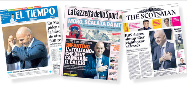 احتفلت صحيفة «تاغس إنزيغر» السويسرية، أمس، بفوز إنفانتينو، المحامي والمحاضر والإداري السابق في اتحاد الكرة الأوروبي، حيث رحب العالم بشكل كبير بتولي إنفانتينو، الأمين العام لـ«اليويفا»، رئاسة «فيفا»، وهي أبرز منصب في عالم كرة القدم، وكذلك توليه مهمة تطبيق حزمة الإصلاحات. وركزت «لاغازيتا» عن جذور إنفانتينو الإيطالية، مشيرة إلى أن إيطالياً سيغير حال «فيفا».