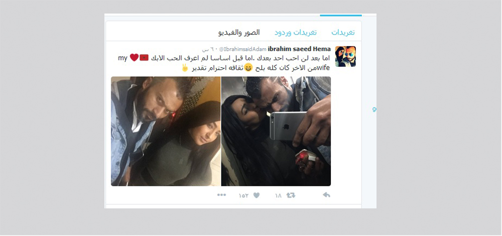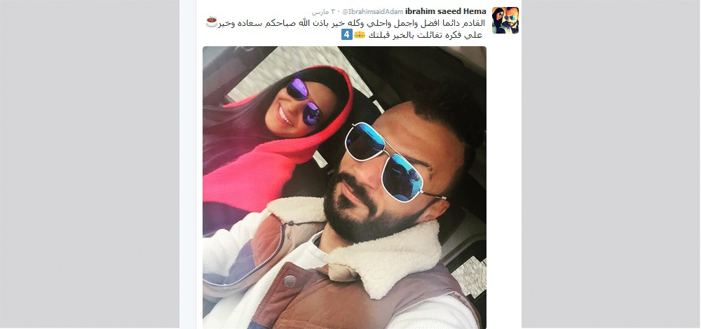 وغرد سعيد معلقاً على "السيلفي" التي تجمعه بزوجته الجديدة المغربية إيمان حمودي، "القادم دائما أفضل وأجمل وأحلى.. وكله خير بإذن الله.. صباحكم سعادة وخير.. على فكرة تفائلت بالخير قبلتك 4".