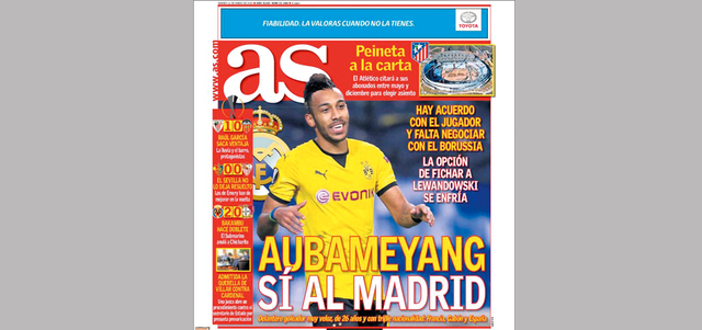 وافق الغابوني، وهداف فريق دورتموند الألماني لكرة القدم، أوباميانغ، على الانتقال إلى ريال مدريد الصيف المقبل، إلا أن الاتفاق لم يكتمل بعد، حيث يتطلب من مدريد الدخول في مفاوضات قوية مع نادي دورتموند غير الراغب في خسارة أهم لاعبيه، كما حصل له سابقاً مع فريق بايرن ميونيخ بخصوص ليفاندوفسكي. يذكر أن أوباميانغ يبلغ من العمر 26 سنة، وله ثلاث جنسيات الإسبانية والفرنسية والغابونية. «أس»