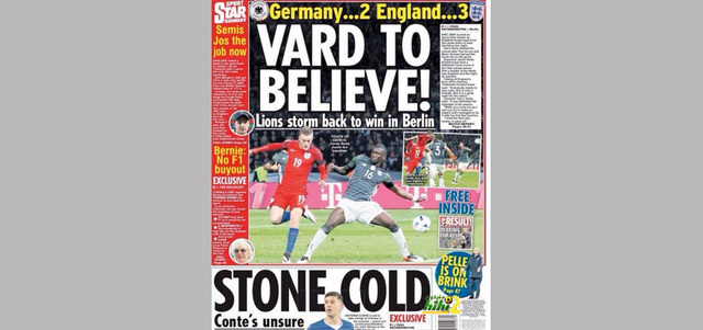 أشادت الصحف الإنجليزية بما فعله نجمها الدولي فيردي ورفاقه في مواجهة الماكينات الألمانية في المباراة الودية أول من أمس وقلب التأخر بهدفين إلى فوز ثمين 3-2، مشيرة إلى التألق الذي صاحبهم والذي تأمل في استمراريته حتى انطلاق كأس الأمم الأوروبية المقبلة حتى يتمكن منتخب إنجلترا من التتويج بها لتعويض إخفاق كأس العالم، وعنونت صحيفة «سبورت ستار» غلافها أمس: «من الصعب التصديق».