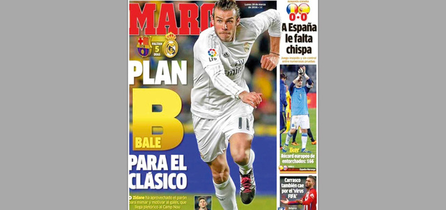 عنونت صحيفة «ماركا» الإسبانية غلافها أمس: «الخطة (ب) بيل»، وقالت إن «المدرب الفرنسي زين الدين زيدان يستغل فترة التوقف للاعتناء باللاعب الويلزي وتحفيزه من أجل الوصول لأفضل حالة في الكلاسيكو أمام برشلونة في المواجهة المرتقبة في الدوري الإسباني لكرة القدم». وأكدت الصحيفة أن «مدريد يسعى لتحقيق نتيجة إيجابية في المواجهة الصعبة في (كامب نو)». دبي ـــ الإمارات اليوم