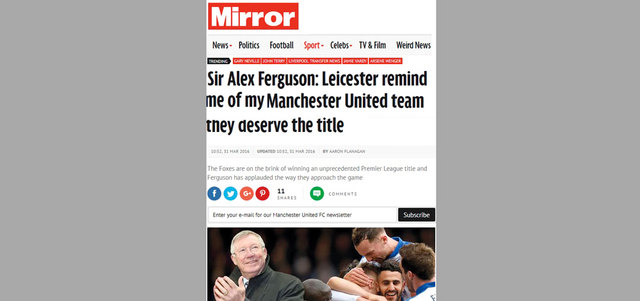 قال أسطورة التدريب العالمية، الأسكتلندي أليكس فيرغسون، إن فريق ليستر سيتي يذكره بأيامه الاولى مع مانشستر يونايتد، والطريقة التي يكافح بها الفريق من اجل فرض نفسه بين الفرق الكبيرة في الدوري الانجليزي. وأشار إلى أنه يتمنى ان يحرز ليستر لقب هذا الموسم بالنظر إلى الجهد الكبير الذي بذله، والتفوق الذي أظهره منذ بداية الموسم وحتى اليوم. وأوضح أنه لا يرى أي تهديد حقيقي على حظوظ ليستر بالتتويج سوى فريق توتنهام. «ميرور»
