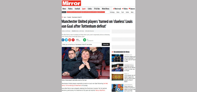يشعر عدد من لاعبي مان يونايتد بأنهم غير راغبين في استمرار مدربهم الحالي، الهولندي لويس فان غال، حيث يقولون إنه يفتقد للمسة المطلوبة من أجل تحقيق النقلة المنتظرة وتحسين أحوال الفريق. وكانت الخسارة الأخيرة من توتنهام بثلاثية نظيفة، سجلت في ست دقائق فقط، القشة التي قصمت ظهر المدرب، وتسببت في توتر العلاقة بينه وبين اللاعبين، فبعد ظهورهم بشكل جيد في المباريات الأخيرة، تعرض الفريق لصدمة قوية قد تنهي رحلة فان غال من القلعة الحمراء. «ميرور»