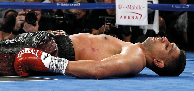 أمير خان يفترش الأرض بعد سقوطه بالضربة القاضية. رويترز