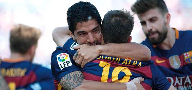 احتفط برشلونة بلقب الدوري الاسباني لكرة القدم بفوزه على مضيفه غرناطة 3-صفر، أمس، في المرحلة الـ38 الأخيرة، وحملت الثلاثية إمضاء هدافه الأوروغوياني لويس سواريز. وتقدم برشلونة في الترتيب بفارق نقطة عن غريمه ريال مدريد الفائز أيضاً على أرض ديبورتيفو لاكورونيا 2-صفر.