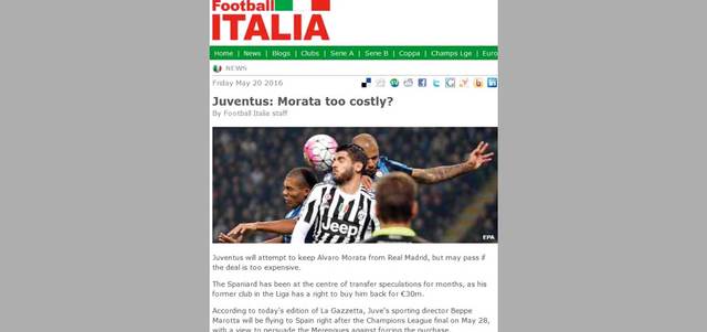أكد نادي يوفنتوس الإيطالي أنه سيحاول الإبقاء على مهاجم الفريق، الإسباني ألفارو موراتا لفترة أطول، من خلال تحويل عقد الإعارة إلى انتقال دائم، لكنه قال إن ذلك قد يكون مكلفاً من الناحية المالية بالنسبة للنادي. ومن حق ريال مدريد استعادة اللاعب مقابل 30 مليون يورو. ومن المتوقع أن يسافر مدير النادي الإيطالي بيبي ماروتا إلى إسبانيا، بعد نهاية أبطال أوروبا، للحديث مع إدارة الملكي حول مستقبل اللاعب. «فووتبل إيطاليا»