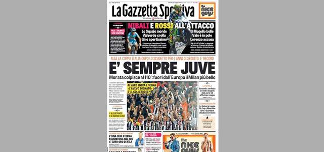 أفردت الصحف الإيطالية، الصادرة صباح أمس، مساحات واسعة للحديث عن تتويج يوفنتوس بطلاً لكأس إيطاليا، بعد تغلبه على ميلان بهدف دون مقابل سجله ألفارو موراتا، فى المباراة النهائية التى جمعتهما أول من أمس، بملعب «الأولمبيكو»، وعنونت «لاغازيتا ديللو سبورت» غلافها: «دائماً اليوفي البطل.. يحصد كأس إيطاليا بعد الكالتشيو.. وموراتا يُسجل فى الدقيقة 110 ويطيح بميلان إلى خارج المسابقات الأوروبية الموسم المقبل».