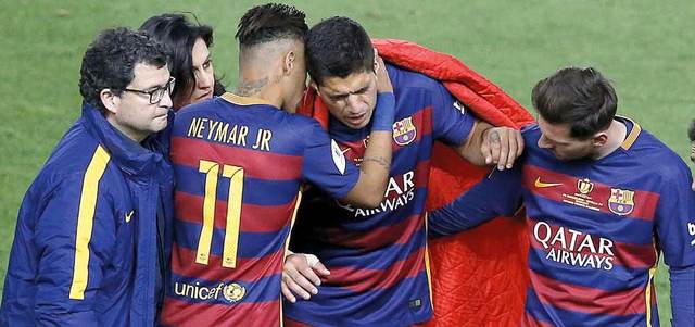 وجاءت إصابة سواريز عند الدقيقة 56 من مباراة اشبيلية التي توج فيها البارسا بكأس ملك إسبانيا، لدى محاولته السيطرة على الكرة قبل أن يخرج وهو يعرج تاركاً مكانه لزميله رافينا، بينما كان التعادل السلبي لايزال سيد الموقف.