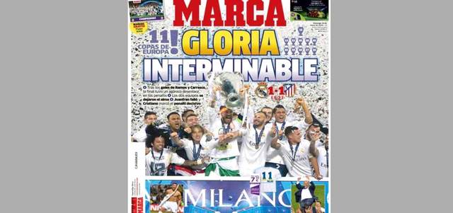 عنونت صحيفة «ماركا» الإسبانية غلافها أمس: «مجد لا ينتهي»، بعد فوز ريال مدريد بلقب دوري أبطال أوروبا لكرة القدم، أول من أمس، على حساب أتلتيكو مدريد في ميلانو بركلات الترجيح 5-3 عقب التعادل 1-1. وقالت الصحيفة: «راموس يسجل للريال، وكاراسكو للأتليتي، والمباراة حسمت بضربات الترجيح، الفريقان قدما كل شيء من أجل الفوز بالملعب، وخوان فران أضاع، فيما رونالدو سجل ضربة الفوز باللقب».