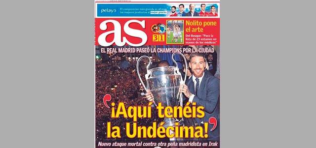 عنونت صحيفة «أس» الإسبانية غلافها أمس: «الحادية عشرة هنا» بعد وصول بعثة ريال مدريد إلى العاصمة الإسبانية بصحبة كأس دوري أبطال أوروبا، التي فاز بها الفريق على حساب أتلتيكو مدريد بركلات الترجيح في ميلانو، وقالت الصحيفة إن «الريال قام بجولة في المدينة مع دوري الأبطال، واحتفل اللاعبون والجماهير باللقب الـ11 في تاريخ النادي الملكي». دبي ــ الإمارات اليوم
