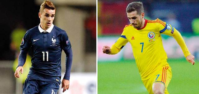 نجم منتخب رومانيا تشيبسي في مواجهة الفرنسي غريزمان اليوم. أ.ف.ب