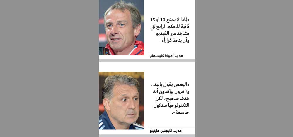 طالب مدربا الولايات المتحدة الأميركية، الألماني يورغن كلينسمان، ونظيره الأرجنتيني خيراردو مارتينو، أول من أمس، الاتحاد الدولي لكرة القدم، والاتحادات القارية، باعتماد التحكيم بالفيديو بعد إقصاء البرازيل من الدور الأول لكأس الأمم الأميركية الجنوبية لكرة القدم «كوبا أميركا» بهدف سجل باليد.