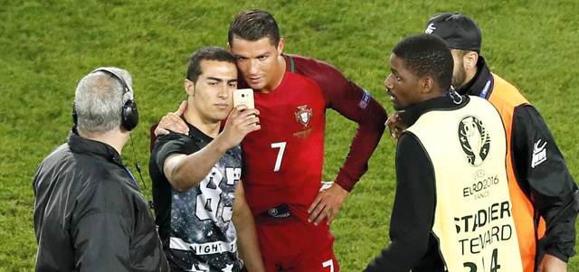 مشجع اقتحم أرض الملعب والتقط «سيلفي» مع رونالدو. أ.ب
