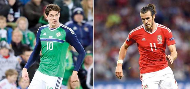 بايل في حوار خاص اليوم مع مهاجم أيرلندا الشمالية لافيرتي. أ.ف.ب