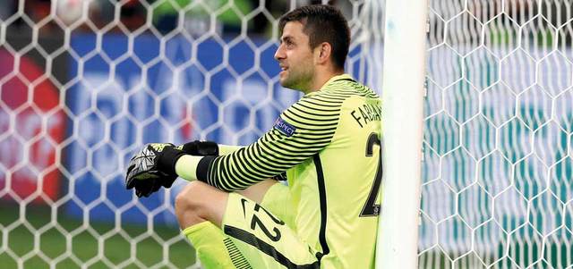 حارس بولندا فابيانسكي مستاء بعد الخروج على يد البرتغال. أ.ب