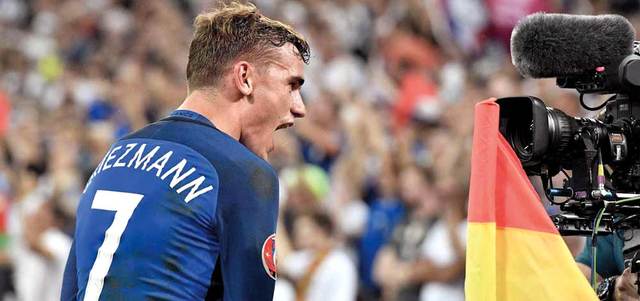 فرحة هستيرية لغريزمان بعد الفوز التاريخي على ألمانيا. أ.ب