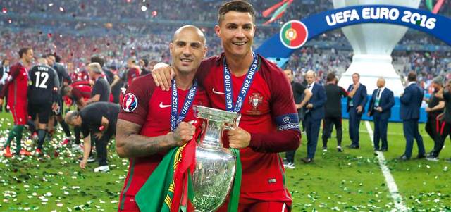 رونالدو وكواريسما يحتفلان بلقب أوروبا. أ.ب