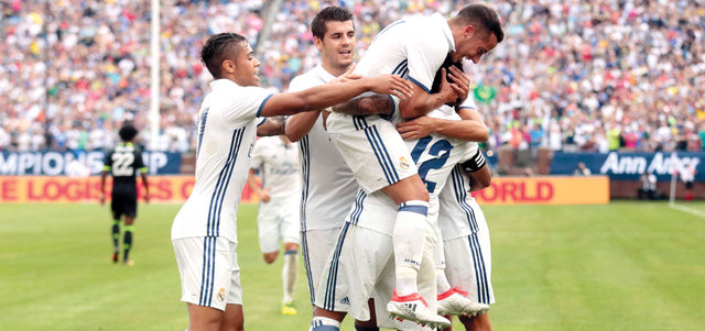 شاهد 105 آلاف و826 مشجعاً ريال مدريد وهو يسجل ثلاثة أهداف في الشوط الأول، ليهزم تشيلسي 3-2 في مباراة ودية باستاد ميشيغان في الولايات المتحدة، أول من أمس.