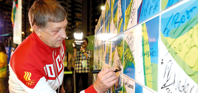رئيس بعثة روسيا إيغور يوقّع على جدار الهدنة الأولمبية في ريو. إي.بي.إيه
