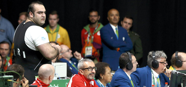 الربّاع الإيراني بهداد سلیمي ينظر إلى قضاة رفع الأثقال بغضب شديد. رويترز