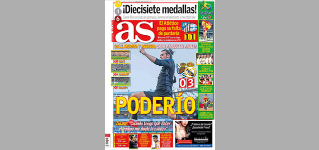 عنونت صحيفة «أس» غلافها أمس: «القوة»، بعد فوز ريال مدريد على ريال سوسييداد بثلاثية نظيفة في انطلاقة الدوري الإسباني، وأشادت بالانتصار الذي تحقق خارج قواعد النادي الملكي. وقالت الصحيفة: «بيل وموراتا واسنسيو هجوم كبير». وأضافت أن المدرب زين الدين زيدان حائر حول التشكيلة الأساسية للفريق، وعنونت في صفحاتها الداخلية: «زيدان: عندما أفكر في تشكيل الفريق رأسي تؤلمني».