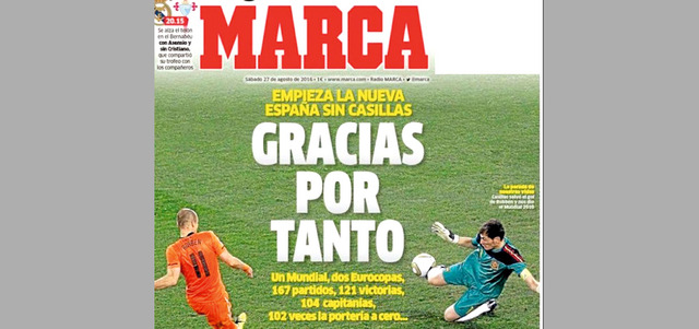 بدأ منتخب إسبانيا الجديد من دون الاسم الذي ارتبط به لأكثر من 15 سنة، دافع فيها كاسياس عن قميص الماتادور، وكان احد أهم الأسماء التي صنعت مجد المنتخب الإسباني بعد فوزه ببطولتين أوربيتين، وكأس العالم في 2010، فقد لعب له 167 مباراة، وأسهم في 121 انتصاراً، وكان قائد المنتخب في 104 مباريات، وخاض معه 102 مباراة بشباك نظيفة، ورغم أن المدرب لوبيتيغي ترك الباب مفتوحاً لعودته، إلا أنه عملياً تعتبر هذه نهاية رحلة كاسياس مع إسبانيا.