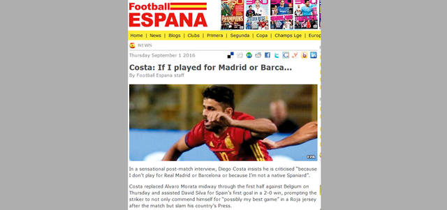 قال الإسباني دييغو كوستا إنه يتعرض للانتقاد بشكل دائم في إسبانيا، كونه لم يكن لاعباً في ريال مدريد أو برشلونة، أو لكونه ليس من جذور إسبانية، كونه لاعباً مجنساً فقط. وأشار كوستا إلى أن مرحلة جديدة بدأت بالنسبة للمنتخب الاسباني، وأنه شعر بأنه أضاف الشيء الكثير للماتادور، لكنه يتمنى على وسائل الإعلام أن تخفف من النقد الموجه له، وأنه يأمل أن يعود للتهديف مع المنتخب الاسباني قريباً.