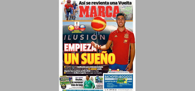 عنونت صحيفة «ماركا» الإسبانية غلافها أمس: «فرصة اسينسيو»، بعد انضمامه للمنتخب الإسباني، الذي يخوض حالياً تصفيات أوروبا المؤهلة إلى نهائيات كأس العالم «روسيا 2018»، مشيرة إلى أن هناك فرصة كبيرة تنتظر النجم الإسباني للظهور مع منتخب بلاده مع طموحات كبيرة من قبله في أن يتمكن في وضع بصمته مع المنتخب، وإثبات نجوميته التي برز فيها مع ريال مدريد. دبي ـــ الإمارات اليوم