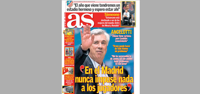 تحدّث المدرب السابق لريال مدريد، والمدير الفني الحالي لبايرن ميونيخ الألماني، الإيطالي أنشيلوتي، عن الفترة التي قاد فيها الملكي لموسمين، وقال إنه لم يتم فرض أي لاعب عليه، وأثنى على القدرات الكبيرة التي يمتلكها زيدان كشخصية ومعلومات فنية. وأشار إلى أنه لابد من الصبر على الكولومبي خيمس رودريغيز، موضحاً أنه لاعب بمهارة كبيرة، وأنه لابد ان يمنح فرصة كاملة.