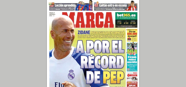 تواصل صحيفة «ماركا» الإسبانية تسليط الضوء على نتائج زيدان مع ريال مدريد، الذي لم يخسر هذا الموسم وفاز في مبارياته الثلاث في الدوري، فضلاً عن قلب تأخره بهدف إلى فوز على سبورتينغ لشبونة في دوري الأبطال. وقالت الصحيفة «المحضّر الحماسي»، مع صورة كبيرة لزيدان. «ماركا»
