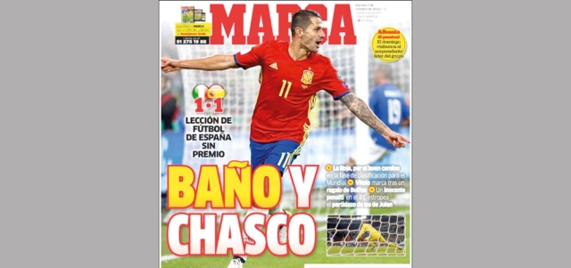 تناولت صحيفة «ماركا» الإسبانية تعادل منتخب بلادها مع إيطاليا، حيث وضعت صورة كبيرة للاعب اشبيلية فيكتور فيتولو الذي أحرز هدف التقدم لبلاده مستغلاً خطأ من بوفون حارس ايطاليا، وصفته بأنه يحلق كالحمام، لكن ايطاليا عادلت النتيجة من ضربة جزاء.