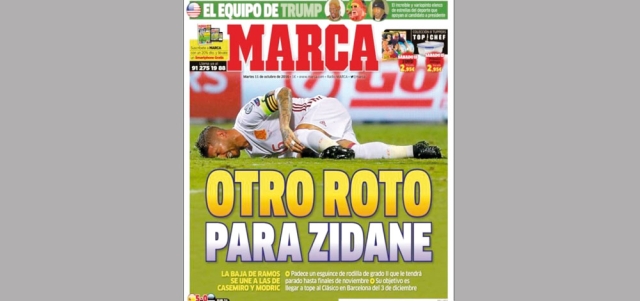 أبرزت صحيفة «ماركا» الإسبانية الإصابة التي تعرض لها مدافع منتخب إسبانيا سيرجيو راموس خلال مباراة اسبانيا وألبانيا الأحد، حيث أظهرت التقارير غيابه ستة أسابيع، وقالت الصحيفة إن هذه الاصابة ضربة جديدة لمدرب الريال زيدان.«ماركا»