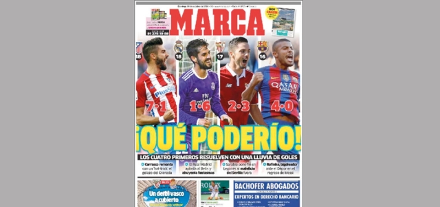 تحدثت صحيفة «ماركا» الإسبانية عن فوز رباعي المقدمة أتليتكو ومدريد وأشبيلية وبرشلونة على خصومها بالجولة الثامنة من الليغا، ومواصلتها الصدارة والبقاء في قمة المنافسة على لقب «الليغا»، وعنونت غلافها: «السلطة لمن؟».