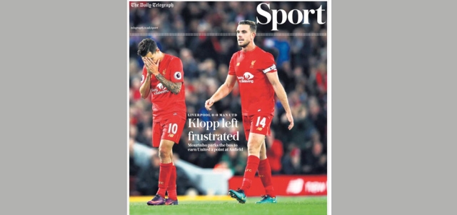 شعر مدرب ليفربول، الألماني يورغن كلوب، بأن فرصة ثمينة ضاعت منه، لاعتلاء صدارة الدوري الإنجليزي، بعد أن اضطر للقبول بالتعادل الذي وصفه بالمخيب مع الغريم التقليدي، مانشستر يونايتد. وفي المقابل، اعتبر مدرب الشياطين مورينيو أن التعادل نتيجة ثمينة للغاية، خصوصاً أنها على أرض ليفربول.