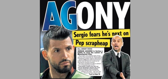 بدأت تلوح في الأفق ملامح علاقة متوترة بين مدرب مان سيتي، غوارديولا، ونجم الفريق الأرجنتيني أغويرو، التي كانت ظهرت خلال لقاء برشلونة، حين تعمد غوارديولا إجلاس هداف سيتي على الدكة، ولم يشركه إلا في الدقائق الأخيرة، ما يجعل مستقبله غير مضمون. «ديلي ستار»