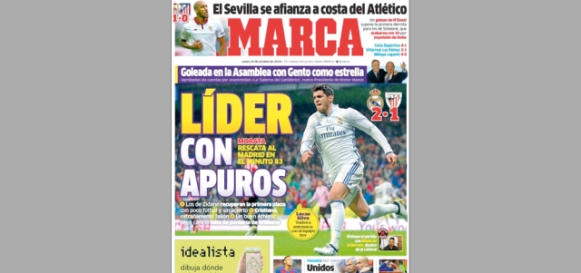 أثنت صحيفة «ماركا» الإسبانية على المستوى المميز للنجم موراتا خلال مباراة ريال مدريد مع أتلتيك بلباو، وعنونت غلافها أمس: «موراتا ينقذ مدريد في الدقيقة 83»، وقالت إن «المدرب زين الدين زيدان استرد المركز الأول، ولكن دون نجاح في كرة القدم، أما الدون رونالدو كان مستواه غريباً».