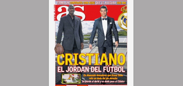 وصفت صحيفة «أس» الإسبانية، البرتغالي كريستيانو رونالدو، بأنه مايكل جوردان كرة القدم، في إشارة إلى النجم التاريخي لكرة السلة الأميركية مايكل جوردان، وذلك بعد أن حصل رونالدو على أضخم عقد للاعب في تاريخ الكرة.