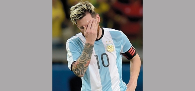 ميسي يغطي وجهه خجلاً من الهزيمة المذلة. أ.ف.ب