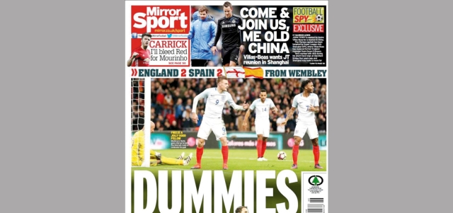 انتقدت صحيفة «ميرور» البريطانية بشدة افتقاد إنجلترا للتركيز في اللحظات الأخيرة من مباراته الودية أمام إسبانيا، بعد أن كان متقدماً بهدفين لصفر، قبل أن تنتفض إسبانيا وتسجل هدفين، ما حول فرحة الإنجليز إلى خيبة كبيرة.