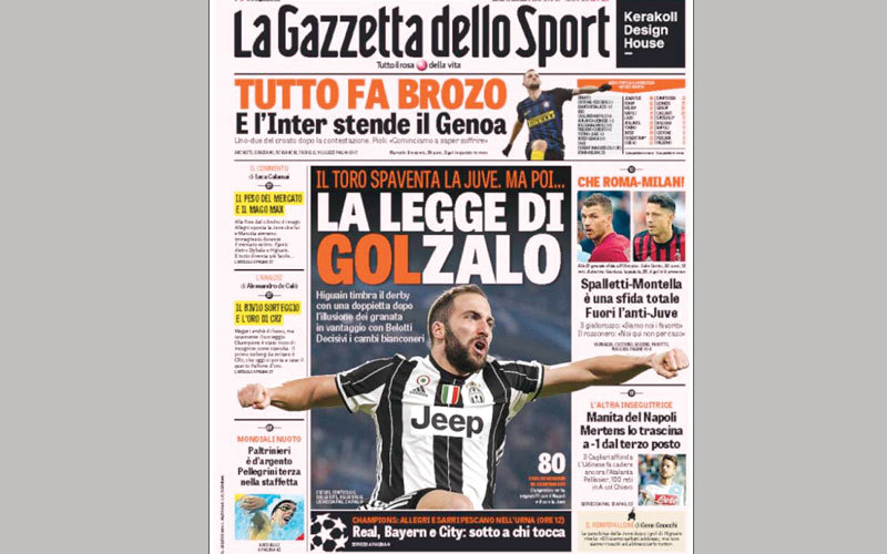 عنونت صحيفة «لاغازيتا ديللو سبورت» غلافها أمس: «قانون غونزالو»، بعد أن قاد النجم الأرجنتيني غونزالو هيغواين فريقه يوفنتوس للفوز على تورينتو 3-1، كان نصيبه منها هدفين، ليرتقي بالسيدة العجوز إلى مقدمة ترتيب الدوري الإيطالي.