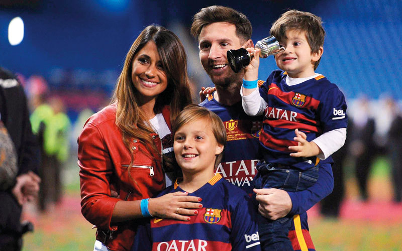 ميسي مع أنتونيلا ويحمل ابنهما تياغو. الإمارات اليوم