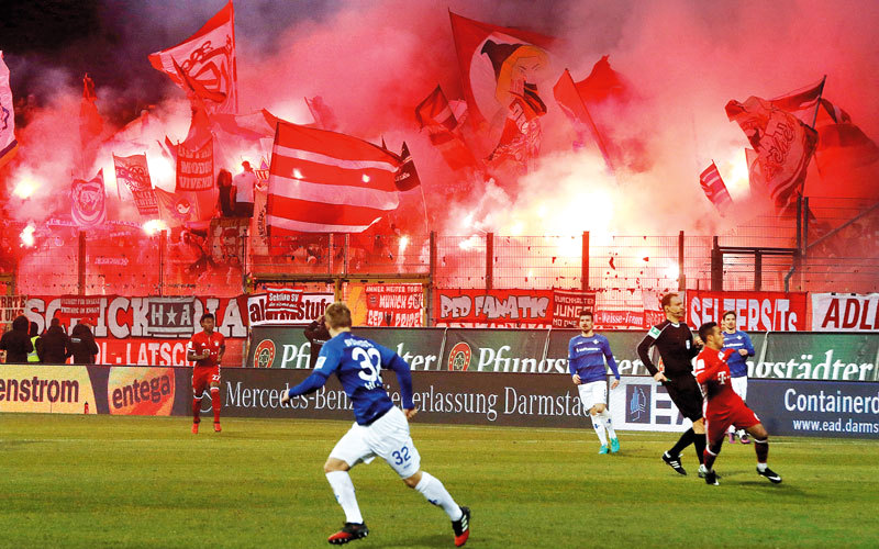 جمهور بايرن ميونيخ يشعل الشماريخ خلال مباراة الفريق أمام دارمشتادت. أ.ب