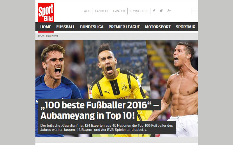 كشفت صحيفة «بيلد» الألمانية عن قائمة الـ100 لأفضل لاعبي كرة القدم في عام 2016، والتي وضعت على رأسها البرتغالي كريستيانو رونالدو، وثانياً الأرجنتيني ليونيل ميسي، كما ضمت في أفضل 10 الغابوني أوباميانغ، والفرنسي غريزمان. «بيلد»