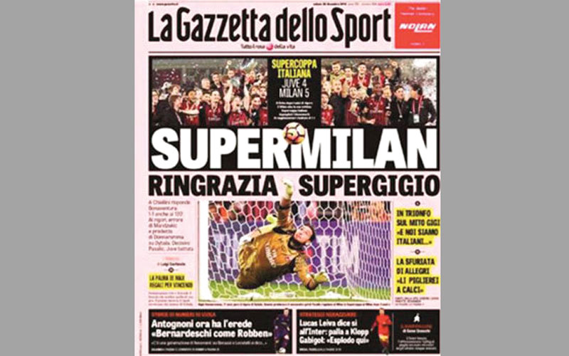 عنونت صحيفة «لاغازيتا ديللو سبورت» الإيطالية غلافها أمس: «سوبر ميلان» بعد فوز النادي اللومباردي بلقب كأس السوبر على حساب يوفنتوس في المواجهة المثيرة التي انتهى وقتها الأصلي والإضافي بالتعادل الإيجابي 1-1، قبل أن يحسمها ميلان بركلات الترجيح.