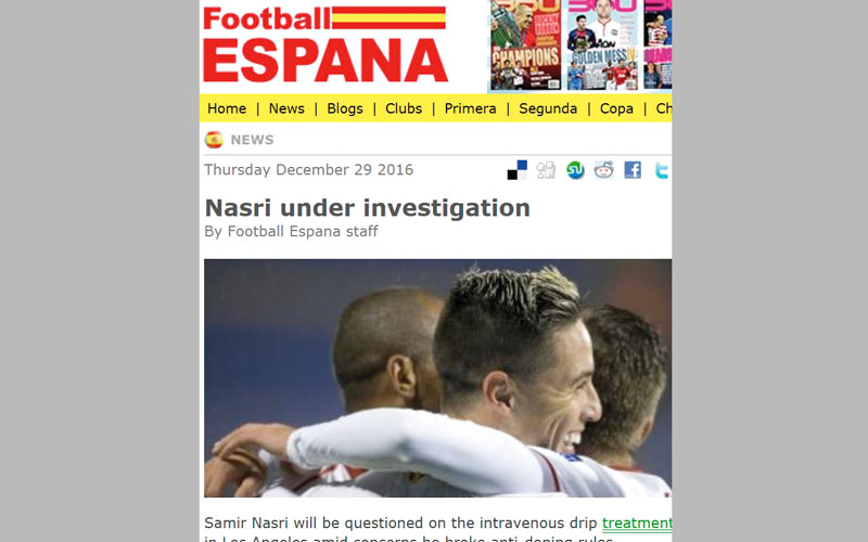فتحت الوكالة الإسبانية لحماية الصحة تحقيقاً مع لاعب إشبيلية، سمير نصري، المعار حالياً من مان سيتي، حول إمكانية خرقه قواعد مكافحة المنشطات، بعد أن تبين خضوعه لعلاج طبيعي في إحدى الوكالات بلوس أنجلوس الأميركية قبل أشهر.