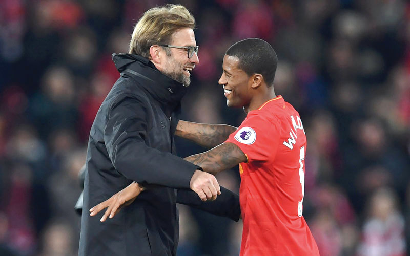 كلوب يحتفل مع جورجينيو بهدف الفوز. أ.ف.ب