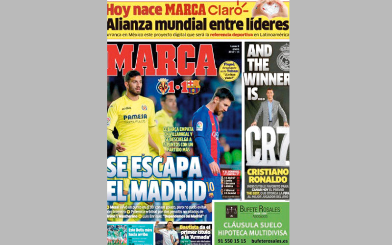 عنونت صحيفة «ماركا» الإسبانية غلافها أمس: «ريال مدريد ابتعد»، في صدارة الليغا بعد تعادل غريمه برشلونة مع فياريال 1-1، ما جعل الفارق بين الفريقين خمس نقاط ومرشحة لتصبح ثماني نقاط لكون الريال يمتلك مباراة مؤجلة، مشيرة إلى أن البارسا تراجع الى المركز الثالث.
