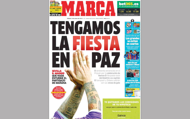 قالت صحيفة «ماركا» إن طرفي قمة الدوري الإسباني اليوم في إشبيلية بين الفريق الأندلسي وضيفه ريال مدريد مدعوان لتهدئة الأوضاع، خصوصاً في أعقاب التوتر الذي صاحب مباراة الكأس الماضية بين بعض جماهير إشبيلية وسيرجيو راموس. «ماركا»